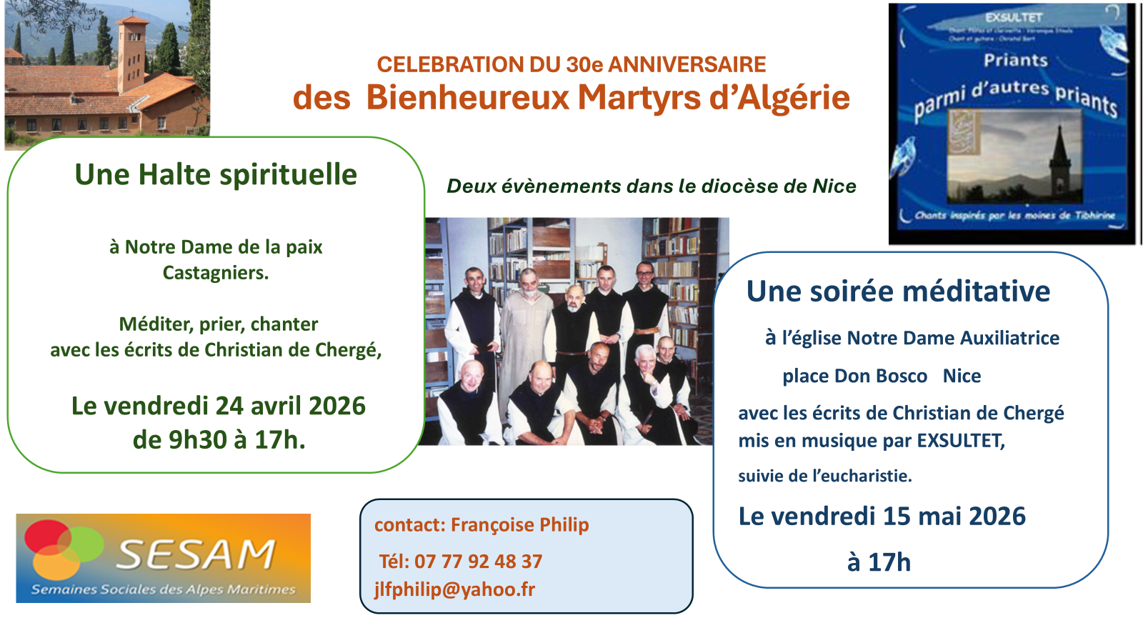 •  25 février - 7/8 mars - 22 avril - 5 mai - 8 mai 2026 - Paroisse Ste Claire en Dauphiné (26) - Temps de mémoire et de célébration- 30 ans de la mort des Bienheureux Martyrs d'Algérie - Conférence de Mgr Guillaud sur l'Eglise en terre d'Islam, We découverte jeunes à Aiguebelle - Conférence de MD Minassian sur le message des 19 - Projections "Le 5eme évangile" et "des Hommes et des Dieux"  - Concert - EN SAVOIR PLUS