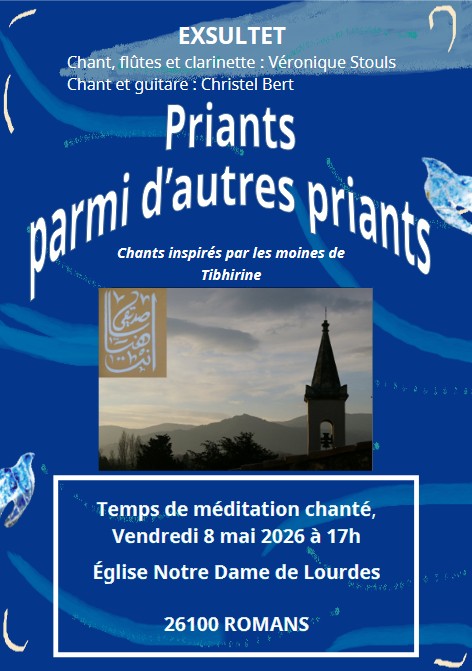 •  vendredi 15 mai 2026 17h - ND Auxiliatrice à Nice (06) - Halte spirituelle , Chants, Eucharistie avec le groupe Exsultet - Contact et inscriptions : Françoise Philipp, Cette adresse e-mail est protégée contre les robots spammeurs. Vous devez activer le JavaScript pour la visualiser.